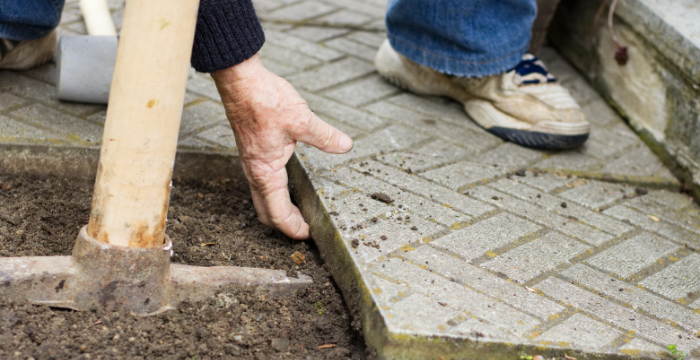 De eerste nieuwe bestrating rondom het buitenbad van De Koerbelt is gelegd. De tegels zijn 1 meter bij 1 meter en hebben een natuursteendeklaag. Een tegel weegt ongeveer 200 kilogram per stuk. Dat is natuurlijk veel te zwaar om te tillen. Daarom leggen ze de tegels met een machine.